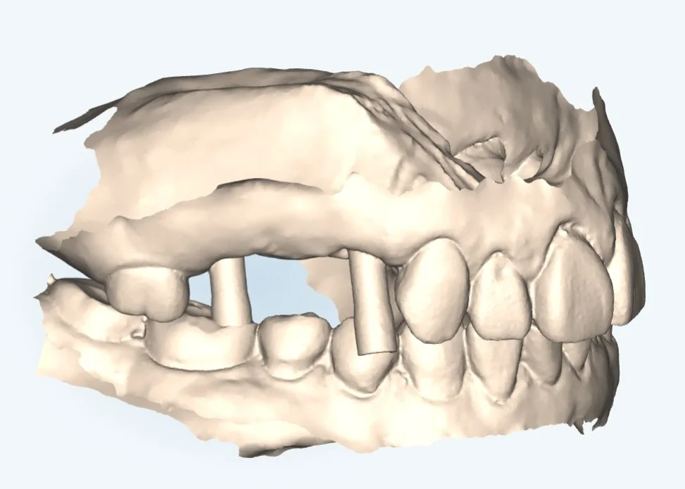 3D dental scan showing upper and lower teeth, some missing teeth, and dental implants.